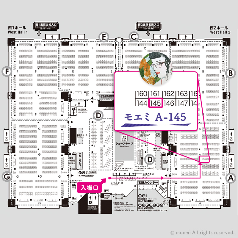 入場口から、Aエリアへ真っ直ぐ進み、Aエリア中央で左折した先にブースがあります。